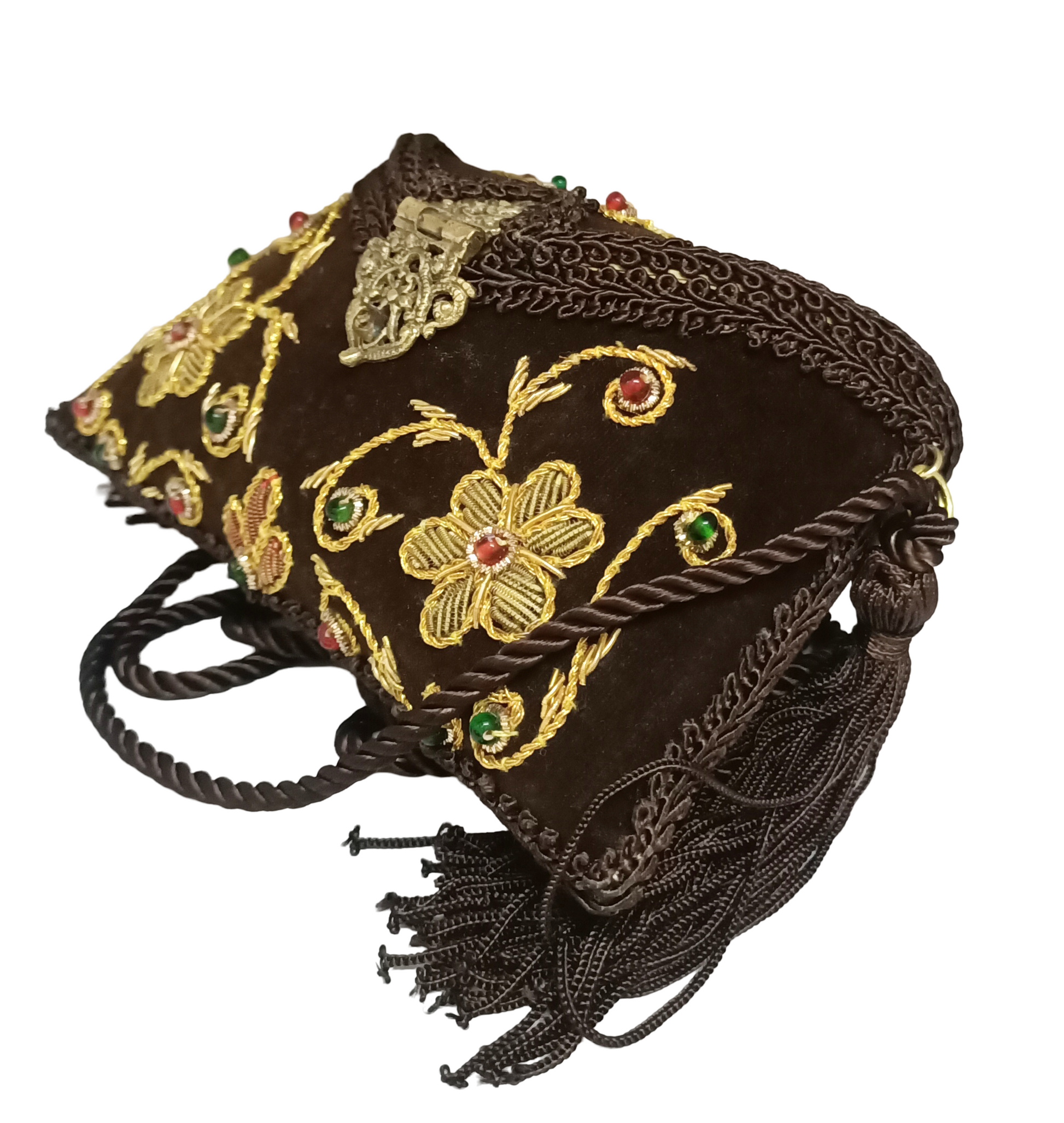 This is flower embroidery ladies purse dark brown color which is made by brass and inside of this purse there is used of velvet and outside is flower embroidery of dark brown color which looks very beautiful and you can carry it at any occasion like weddings, parties, etc.